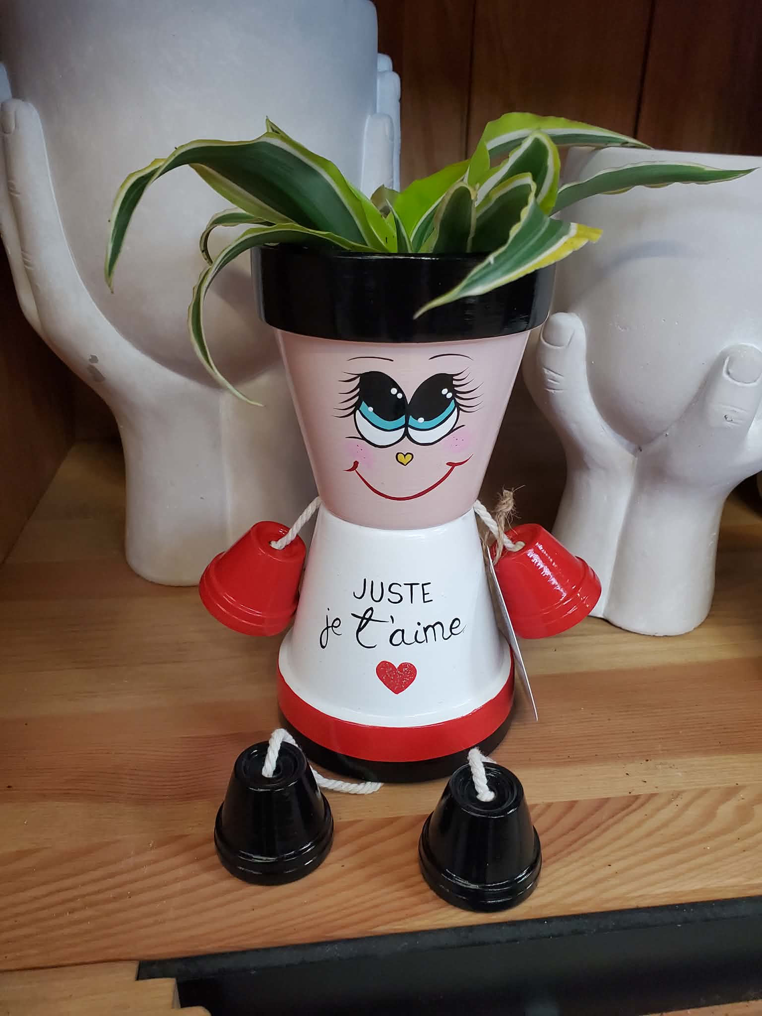 Craquez pour ce personnage pot de fleurs plein de tendresse, une création artisanale unique qui célèbre l’amour avec douceur et poésie. Avec son grand sourire, ses yeux expressifs et son message délicat « Juste je t’aime », il fait fondre les cœurs dès le premier regard.