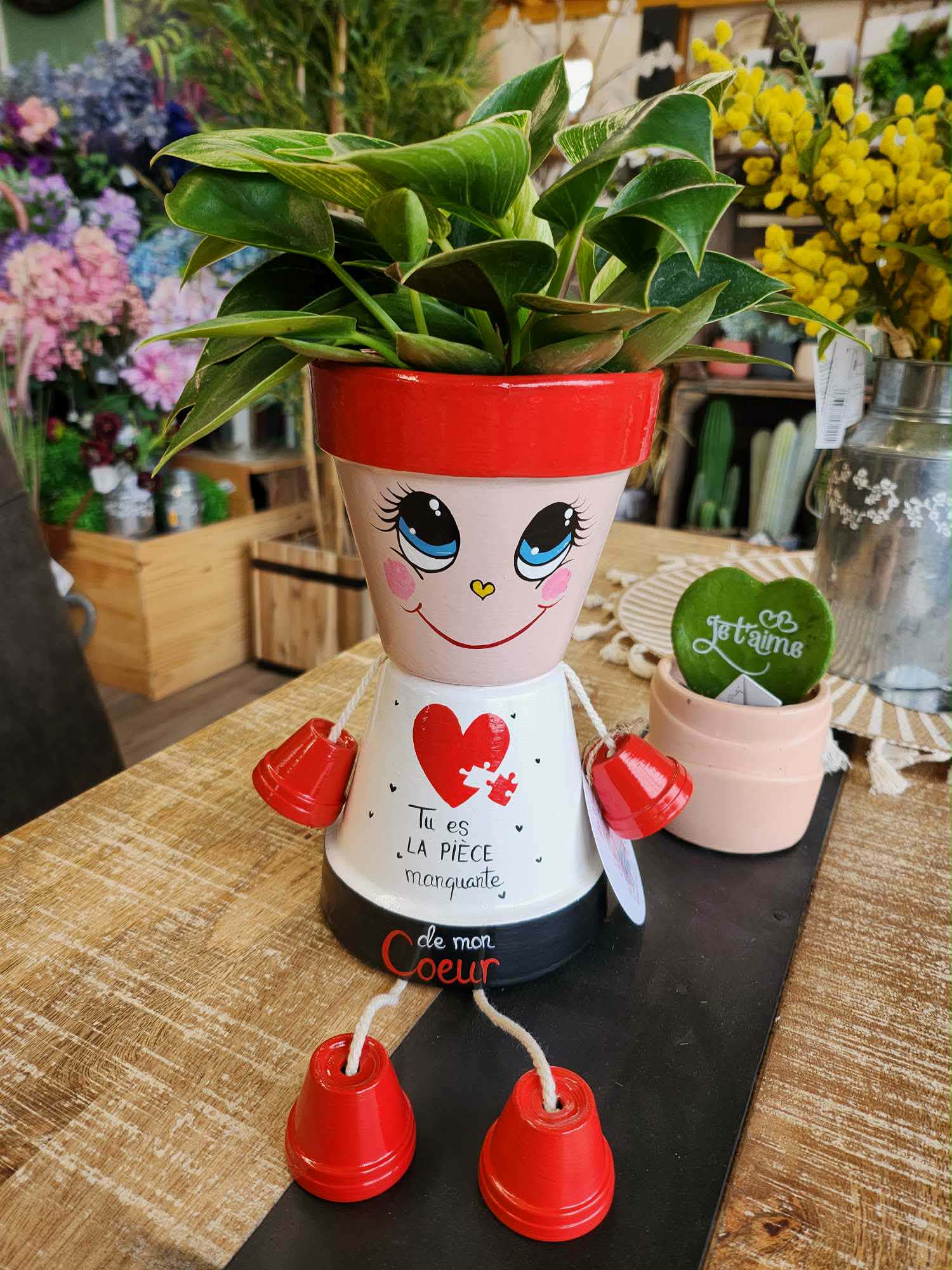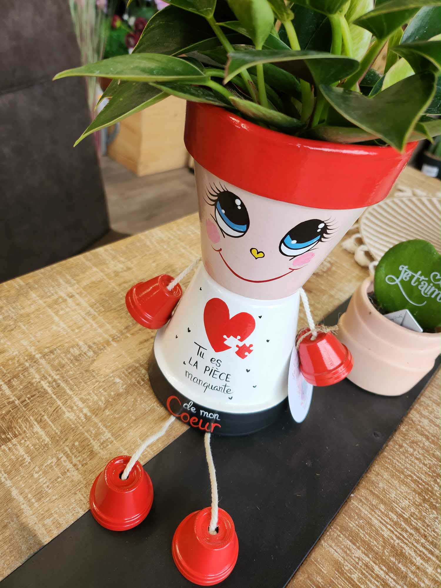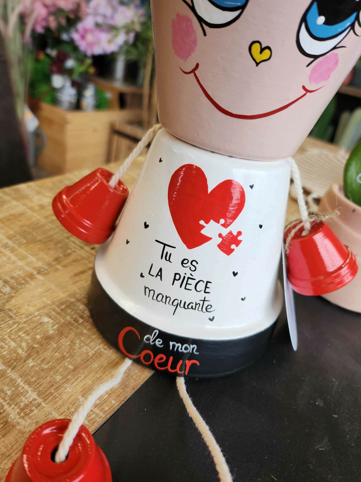 Craquez pour ce personnage pot de fleurs plein de tendresse, une création artisanale unique qui célèbre l’amour avec douceur et poésie. Avec son grand sourire, ses yeux expressifs et son message délicat « Tu es la pièce manquante de mon coeur », il fait fondre les cœurs dès le premier regard.